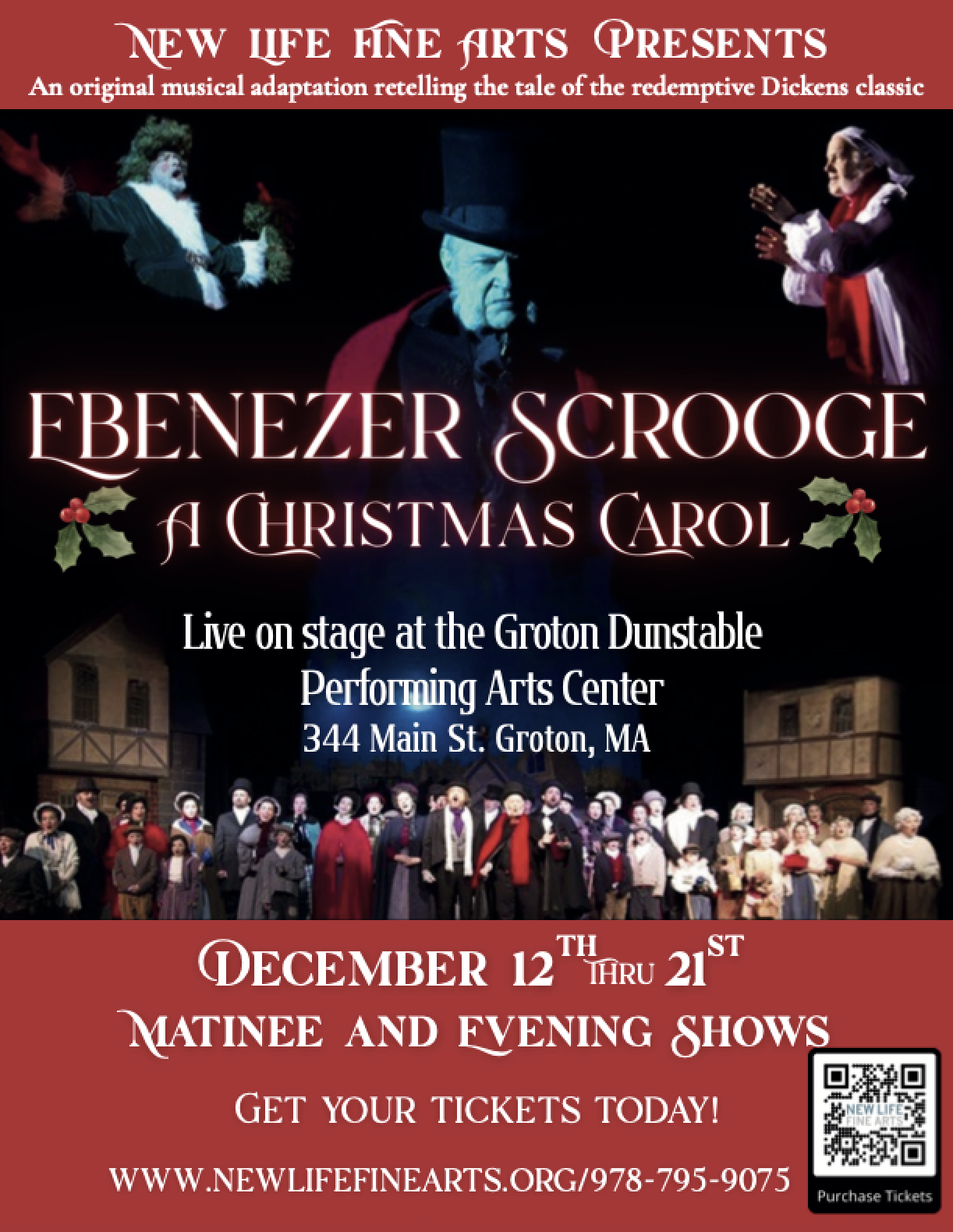 New Life Fine Arts Musical Theater’s popular production Ebenezer Scrooge: A Christmas Carol returns this holiday season to the Groton-Dunstable Performing Arts Center, 344 Main Street, Groton, Massachusetts, for eight performances running December 12-21.